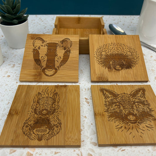 Woodland Animal Cottage Core Engraved Bamboo Coaster Set Home Décor House Warming Christmas Gift Birthday Present