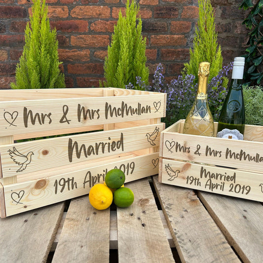 Mr & Mrs Married - Doves Hearts Design - Personalised Wooden Crate Hamper Gift