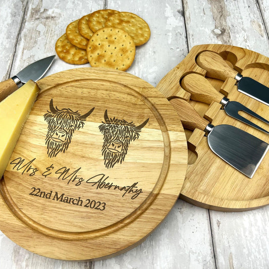Highland Cow Cheese Board Set Utensils - Wedding / 5th Anniversary - Wooden Engraved Personalised Charcuterie Gift