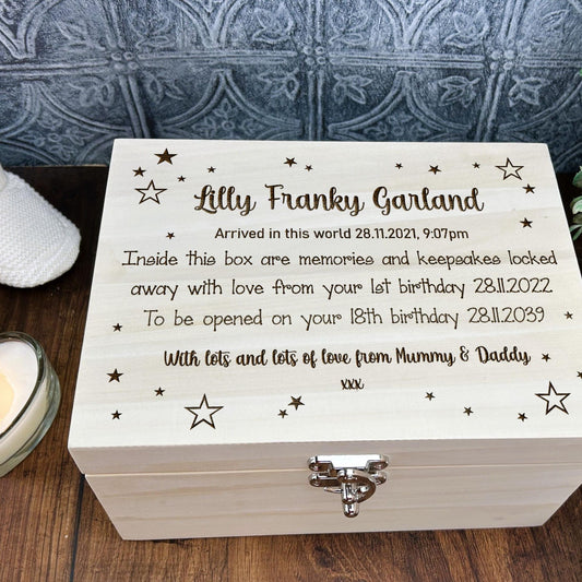 Star Design Time Capsule Personalised Wooden Memory Box Christening / New Baby Gift