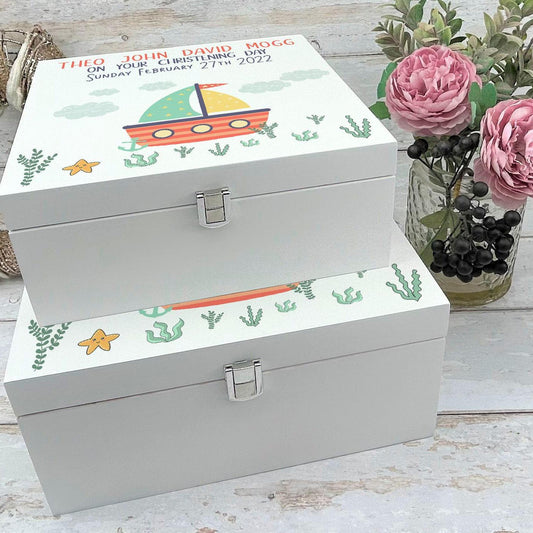 Sailing Boat Sailboat Design White Christening Memory Storage Box - Personalised New Baby Gift