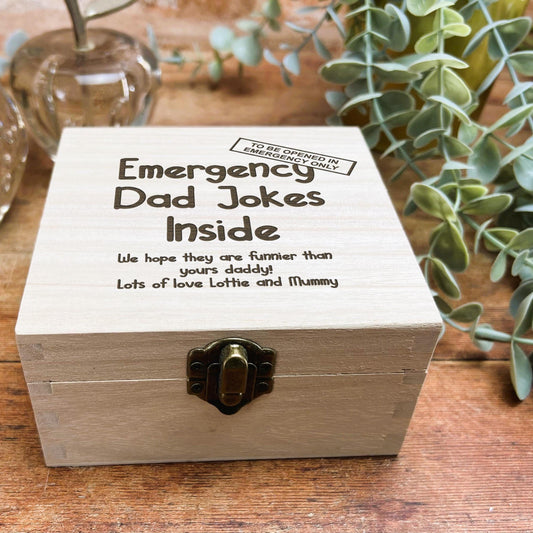 Emergency Dad Jokes – Engraved Personalised Wooden Box – Father’s Day – Birthday Gift