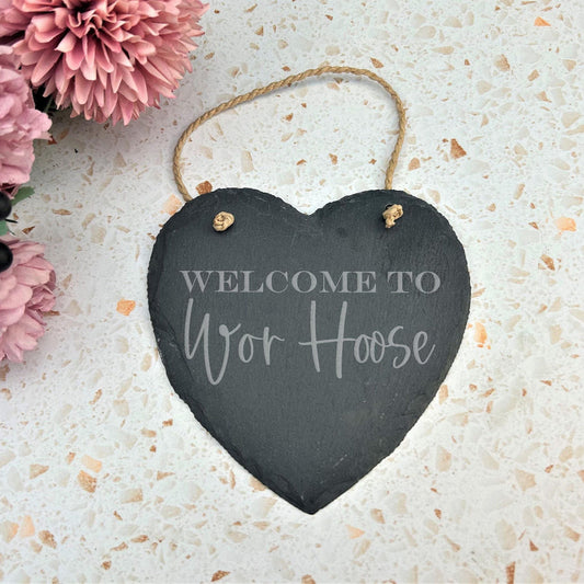 Welcome to Wor Hoose - Newcastle Geordie Dialect - Personalised Slate Heart Plaque