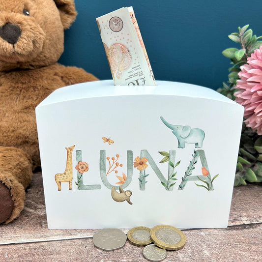 Watercolour Animal Theme Wooden Money Box - Personalised - Children's Saving - New Baby / Christening Gift