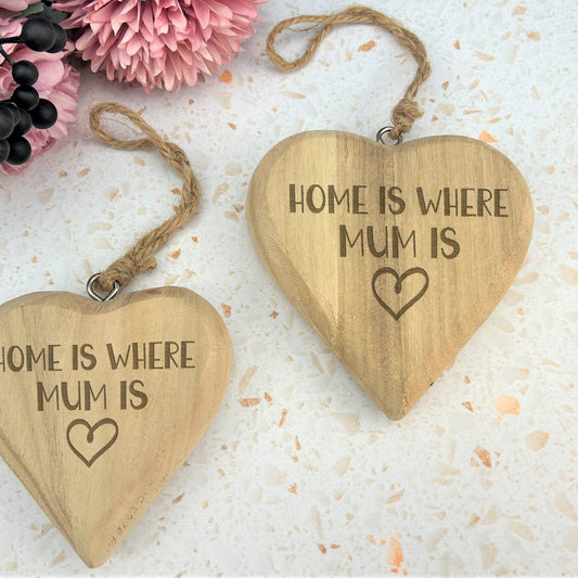Home Is Where Mum Is - Chunky Engraved Wooden Heart Plaque - Mother's Day Present