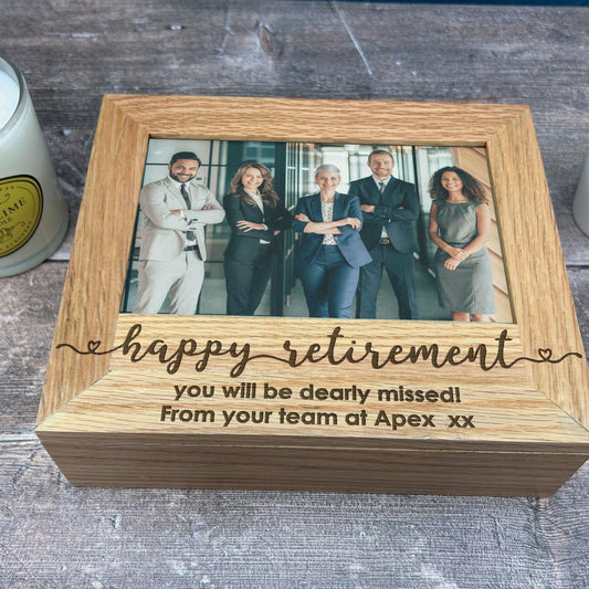 Happy Retirement - Leaving Work - Personalised Memory Box - Photos 6x4 7x5 Holder - Solid Oak
