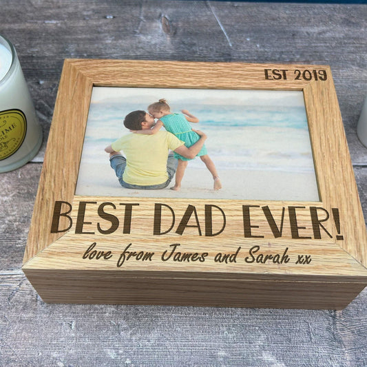 Best Dad Ever - Father's Day - Personalised Memory Box - Photos 6x4 7x5 Holder - Solid Oak Gift