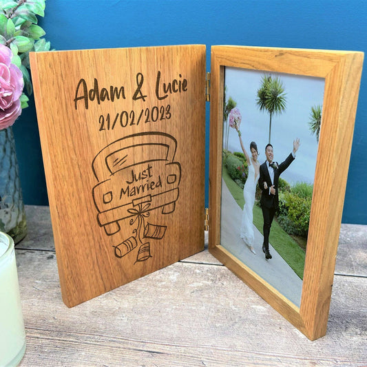 Just Married Car Design Personalised Oak Photo Frame - Wedding Gift