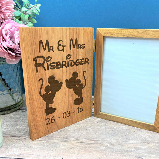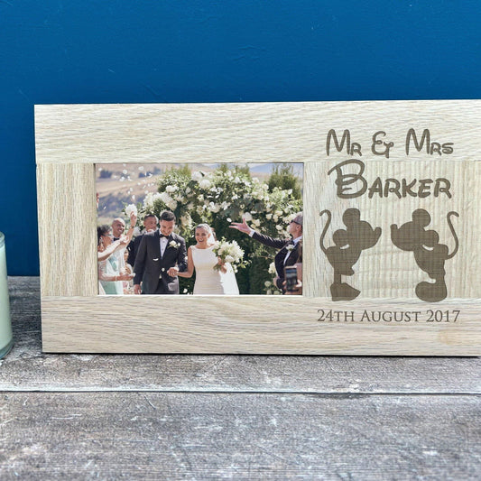 Mickey & Minnie Mouse Design - Personalised Oak Photo Frame - Wedding - Anniversary - Engagement Gift