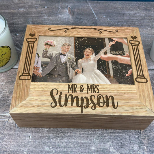 Mr & Mrs - Column Design - Wedding Photos - Personalised Memory Box - Photos 6x4 7x5 Holder - Solid Oak - Wedding Gift