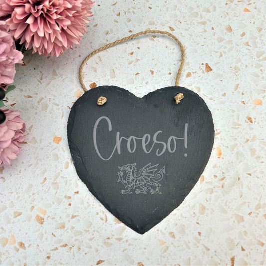 Croeso Welsh Welcome Dragon - Slate Heart Plaque