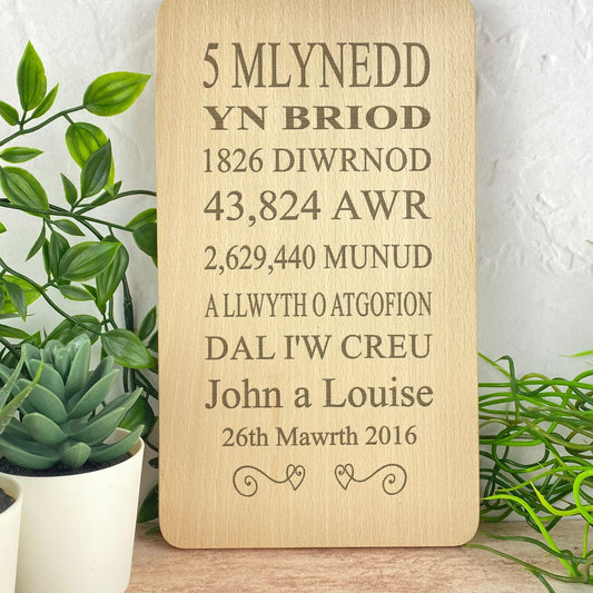 Welsh 5 Years Married Plaque - Fifth Wedding Wooden Anniversary - Personalised Gift