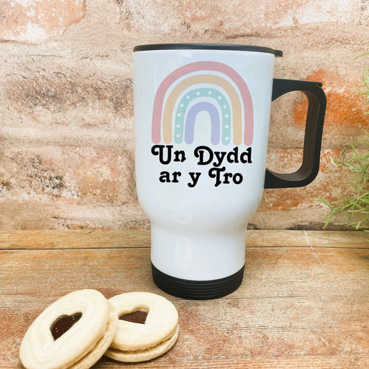 Un Dydd ar y Tro One Day At A Time - Welsh Language Dialect - Personalised Travel Mug