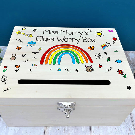 Colourful Childs Doodle Design Worry Box Personalised Primary School Dropbox