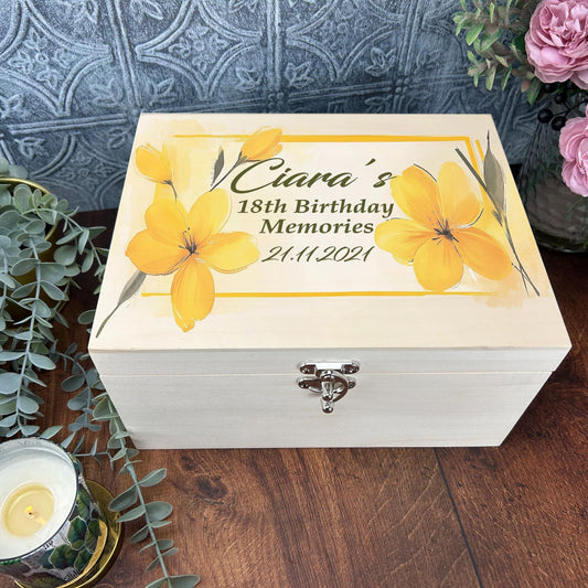 Floral Yellow Watercolour Illustration Personalised Luxury Wooden Memory Box Gift