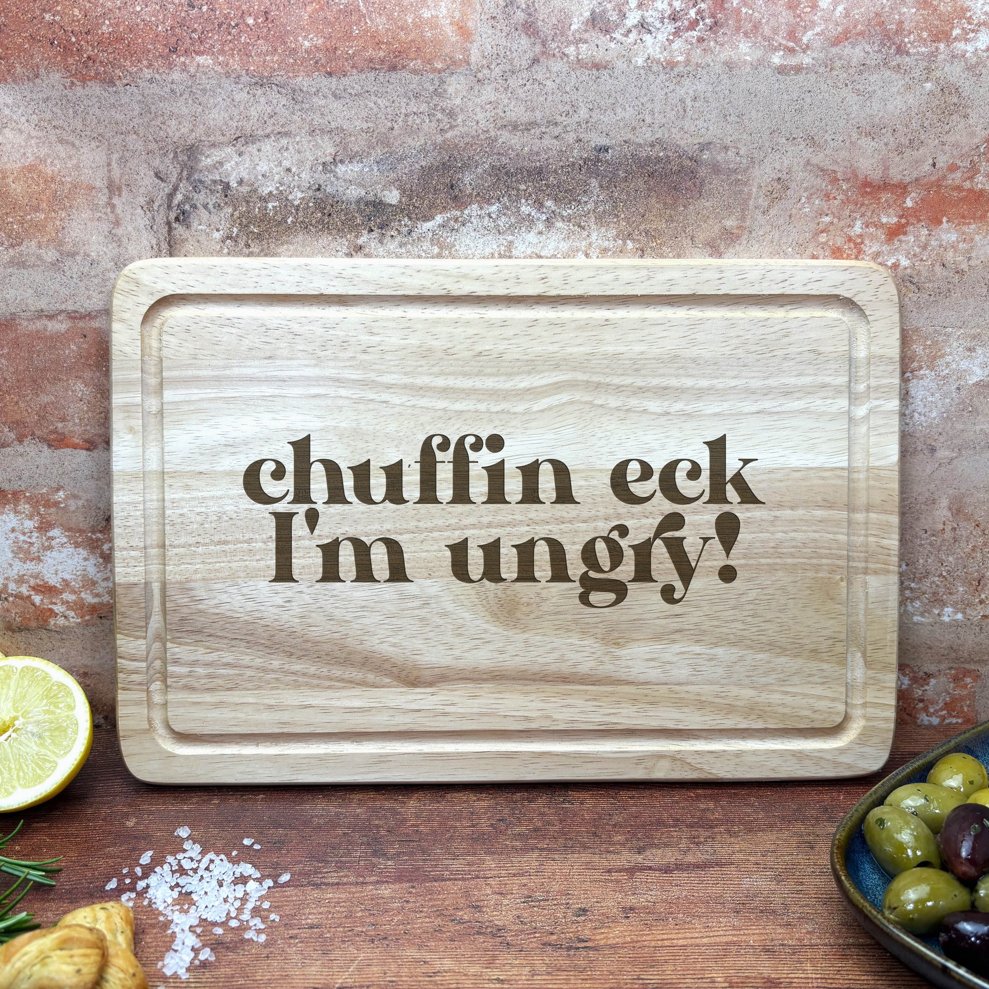Bring a bit of regional pride and cheeky charm into your cooking space with this engraved wooden chopping board! Whether you're repping Chuffin Eck I'm Ungry, or just love a laugh with your lardons, this board is made to impress (and maybe raise a few eyebrows).