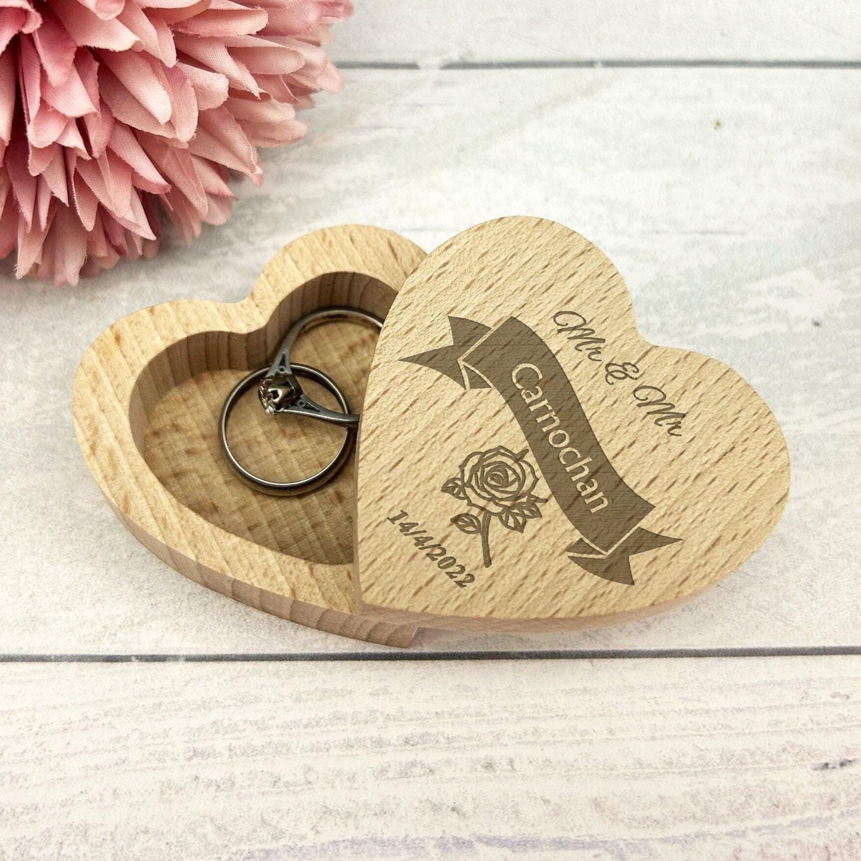 Mr & Mrs Rose Wedding Ring Carrier Heart Box Personalised Engagement Gift